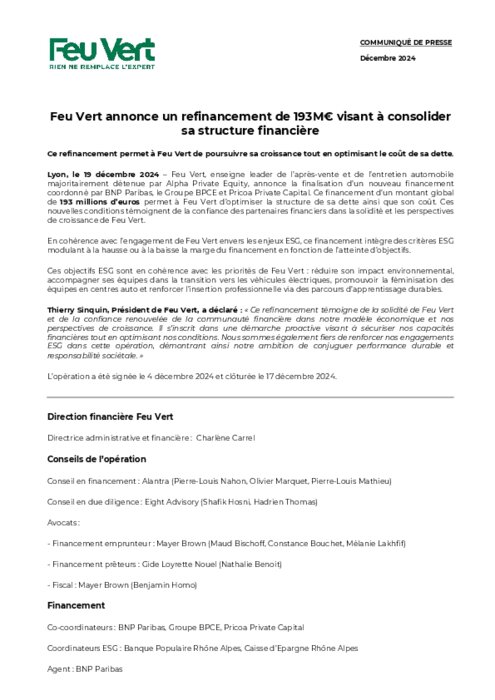 Feu Vert, enseigne leader de l’après-vente et de l’entretien automobile majoritairement détenue par Alpha Private Equity, annonce la finalisation d’un nouveau financement coordonné par BNP Paribas, le Groupe BPCE et Pricoa Private Capital. Ce financement d’un montant global de 193 millions d’euros permet à Feu Vert d’optimiser la structure de sa dette ainsi que son coût. Ces nouvelles conditions témoignent de la confiance des partenaires financiers dans la solidité et les perspectives de croissance de Feu Vert. En cohérence avec l’engagement de Feu Vert envers les enjeux ESG, ce financement intègre des critères ESG modulant à la hausse ou à la baisse la marge du financement en fonction de l’atteinte d’objectifs.