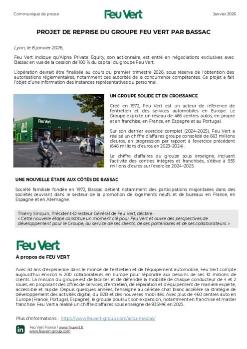 L’opération devrait être finalisée au cours du premier trimestre 2026, sous réserve de l’obtention des autorisations réglementaires, notamment des autorités de la concurrence compétentes. Ce projet a fait l’objet d’une information des instances représentatives du personnel.
