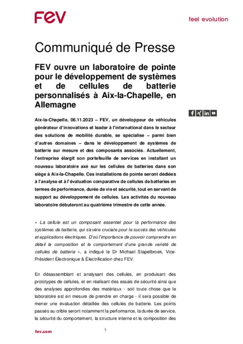 FEV élargit son portefeuille de services en installant un nouveau laboratoire axé sur les cellules de batteries dans son siège à Aix-la-Chapelle. Ces installations de pointe seront dédiées à l’analyse et à l’évaluation comparative de cellules de batteries en termes de performance, durée de vie et sécurité, tout en servant de support au développement de cellules.