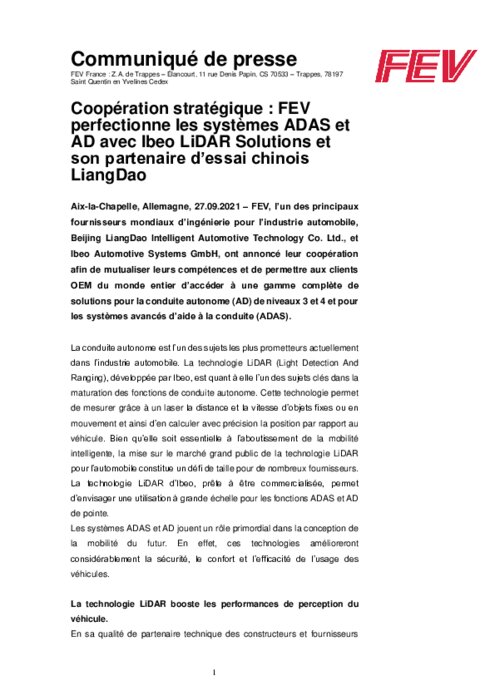 FEV et Ibeo Automotive Systems, ont annoncé leur coopération afin de mutualiser leurs compétences et de permettre aux clients OEM du monde entier d’accéder à une gamme complète de solutions pour la conduite autonome (AD) de niveaux 3 et 4 et pour les systèmes avancés d’aides à la conduite (ADAS).