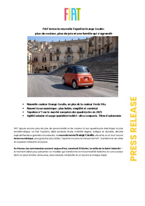 FIAT ajoute encore plus de joie, de personnalité et de couleur à son quadricycle électrique le plus emblématique. La Fiat Topolino, déjà symbole d’une mobilité légère, ludique et durable, dévoile aujourd’hui deux grandes nouveautés : la nouvelle teinte Orange Corallo,vibrante, et un tout nouvel écran numérique, plus grand et plus lisible. Topolino incarne la mission de FIAT : transformer les villes en espaces relaxants et joyeux.
