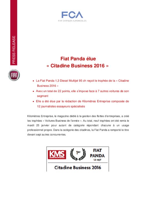Kilomètres Entreprise, le magazine dédié à la gestion des flottes d’entreprises, a créé les trophées « Voitures Business de l’année ». Au total, neuf trophées ont été remis le mardi 25 janvier pour autant de catégorie répondant chacune à un usage professionnel propre. Dans la catégorie des citadines, la Fiat Panda a remporté le titre devant sept autres concurrentes.