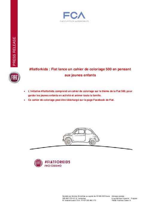 Fiat pense aux jeunes enfants en cette période de confinement, avec l’initiative #fiatforkids. Le cahier de coloriage Fiat 500 – dans le plus pur style Fiat, à la fois simple et amusant – a été conçu spécialement pour que les enfants puissent passer du temps à dessiner et colorier les trois générations de la 500, en leur offrant une totale liberté de créativité et d’imagination, mais aussi en permettant à leurs parents de les garder occupés dans le cadre d’une activité ludique.