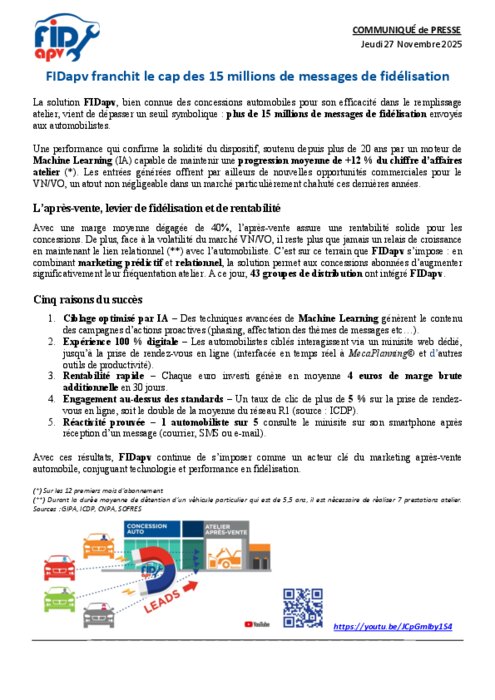 La solution FIDapv, bien connue des concessions automobiles pour son efficacité dans le remplissage atelier, vient de dépasser un seuil symbolique : plus de 15 millions de messages de fidélisation envoyés aux automobilistes.
