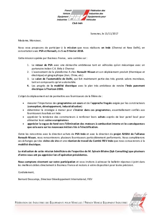 Services 22 novembre 2017 - 17:32 La FIEV réalise un mission en Inde (Chennai et New Delhi), en concertation avec PSA et Renault, du 5 au 9 février 2018. PDF (372 Ko) Télécharger PDF (692 Ko) Télécharger PDF (414 Ko) Télécharger