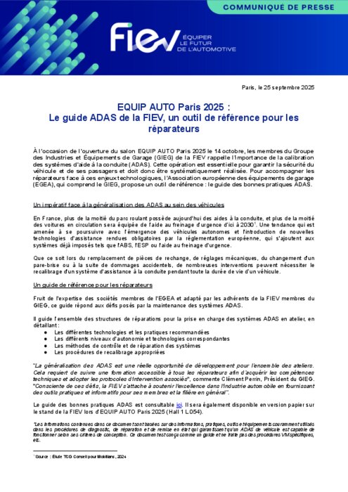 À l’occasion de l’ouverture du salon EQUIP AUTO Paris 2025 le 14 octobre, les membres du Groupe des Industries et Équipements de Garage (GIEG) de la FIEV rappelle l’importance de la calibration des systèmes d’aide à la conduite (ADAS). Cette opération est essentielle pour garantir la sécurité du véhicule et de ses passagers et doit donc être systématiquement réalisée. Pour accompagner les réparateurs face à ces enjeux technologiques, l’Association européenne des équipements de garage (EGEA), qui comprend le GIEG, propose un outil de référence : le guide des bonnes pratiques ADAS.