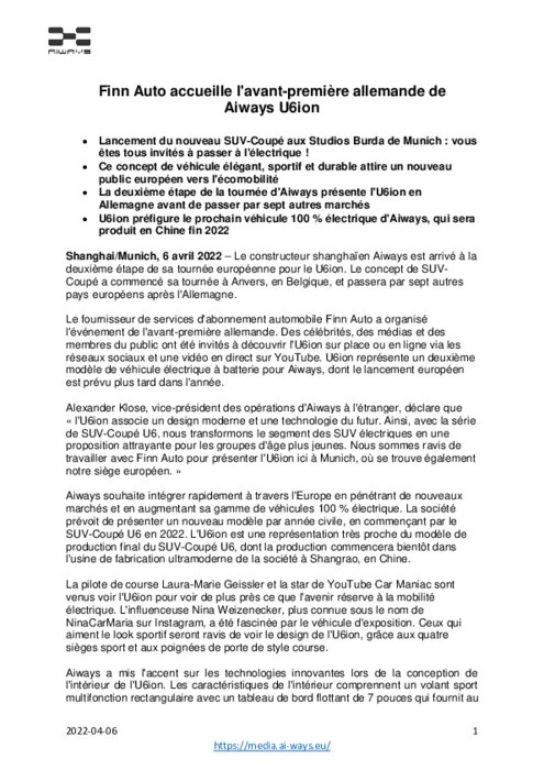 Finn Auto accueille l'avant-première allemande du Aiways U6ion