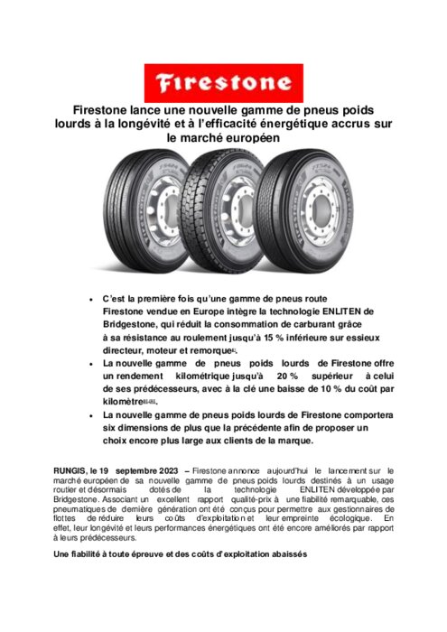 Firestone annonce aujourd’hui le lancement sur le marché européen de sa nouvelle gamme de pneus poids lourds destinés à un usage routier et désormais dotés de la technologie ENLITEN développée par Bridgestone. Associant un excellent rapport qualité-prix à une fiabilité remarquable, ces pneumatiques de dernière génération ont été conçus pour permettre aux gestionnaires de flottes de réduire leurs coûts d’exploitation et leur empreinte écologique.