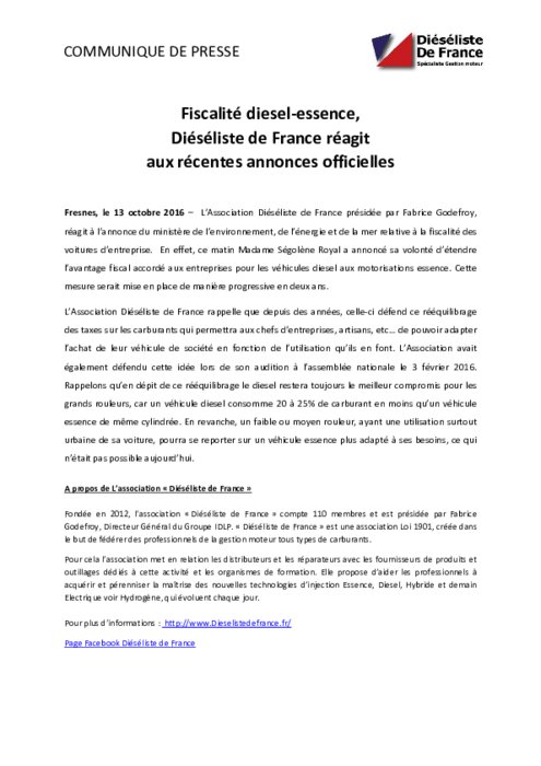 Jeudi 13/10/16, Madame Ségolène Royal a annoncé sa volonté d’étendre l’avantage fiscal accordé aux entreprises pour les véhicules diesel aux motorisations essence. Cette mesure serait mise en place de manière progressive en 2 ans. L’Association Diéséliste de France rappelle que depuis des années, celle‐ci défend ce rééquilibrage des taxes sur les carburants qui permettra aux chefs d’entreprises, artisans, etc... de pouvoir adapter l’achat de leur véhicule de société en fonction de l’utilisation.