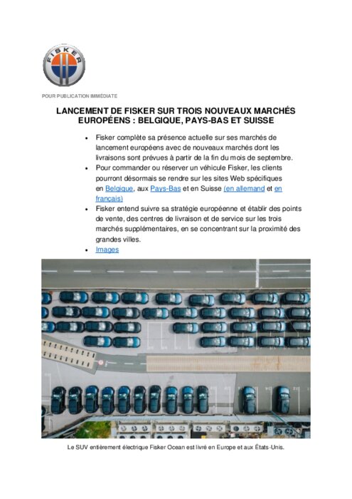 Fisker complète sa présence actuelle sur ses marchés de lancement européens avec de nouveaux marchés dont les livraisons sont prévues à partir de la fin du mois de septembre. Pour commander ou réserver un véhicule Fisker, les clients pourront désormais se rendre sur les sites Web spécifiques en Belgique, aux Pays-Bas et en Suisse (en allemand et en français).
