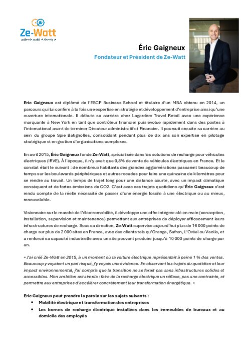 Eric Gaigneux est diplômé de l’ESCP Business School et titulaire d’un MBA obtenu en 2014, un parcours qui lui confère à la fois une expertise en stratégie et développement d’entreprise ainsi qu’une ouverture internationale. Il débute sa carrière chez Lagardère Travel Retail avec une expérience marquante à New York en tant que contrôleur financier puis évolue rapidement dans des postes à l’international avant de terminer Directeur administratif et Financier. Il poursuit ensuite sa carrière au sein du groupe Spie Batignolles, consolidant pendant plus de dix ans son expertise en pilotage stratégique et en gestion d’organisations complexes.
