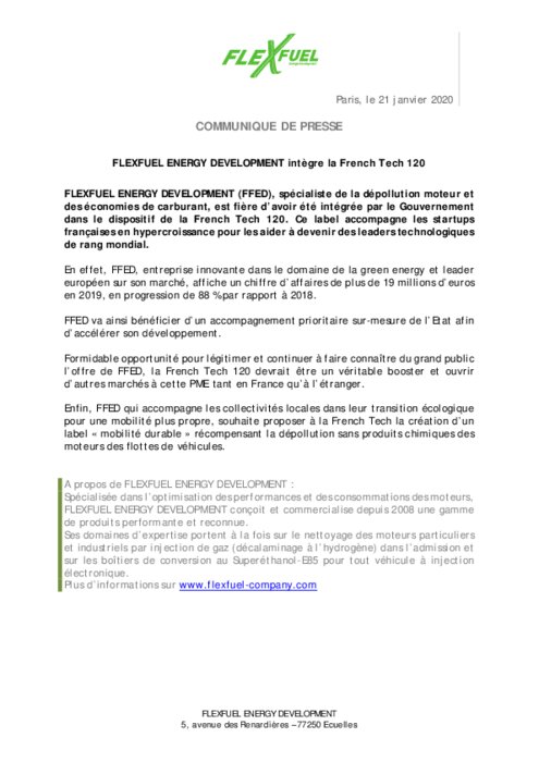 FLEXFUEL ENERGY DEVELOPMENT (FFED), spécialiste de la dépollution moteur et des économies de carburant, est fière d'avoir été intégrée par le Gouvernement dans le dispositif de la French Tech 120. Ce label accompagne les startups françaises en hypercroissance pour les aider à devenir des leaders technologiques de rang mondial.
