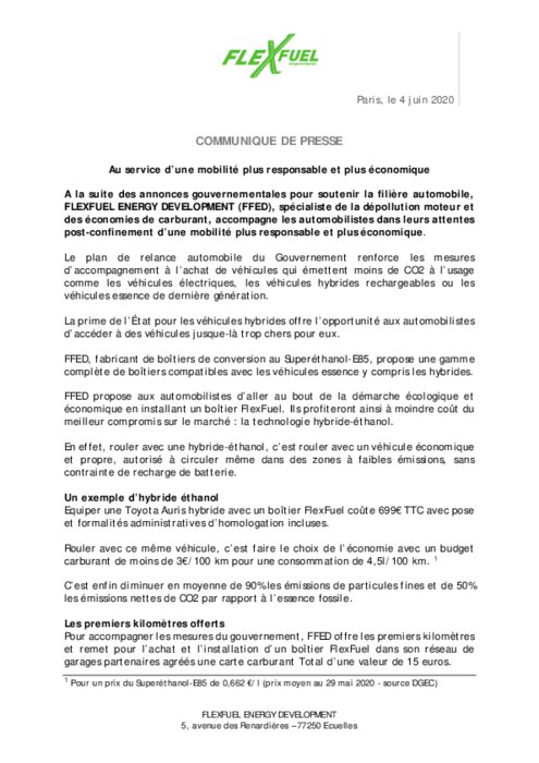A la suite des annonces gouvernementales pour soutenir la filière automobile, FLEXFUEL ENERGY DEVELOPMENT (FFED), spécialiste de la dépollution moteur et des économies de carburant, accompagne les automobilistes dans leurs attentes post-confinement d'une mobilité plus responsable et plus économique.
