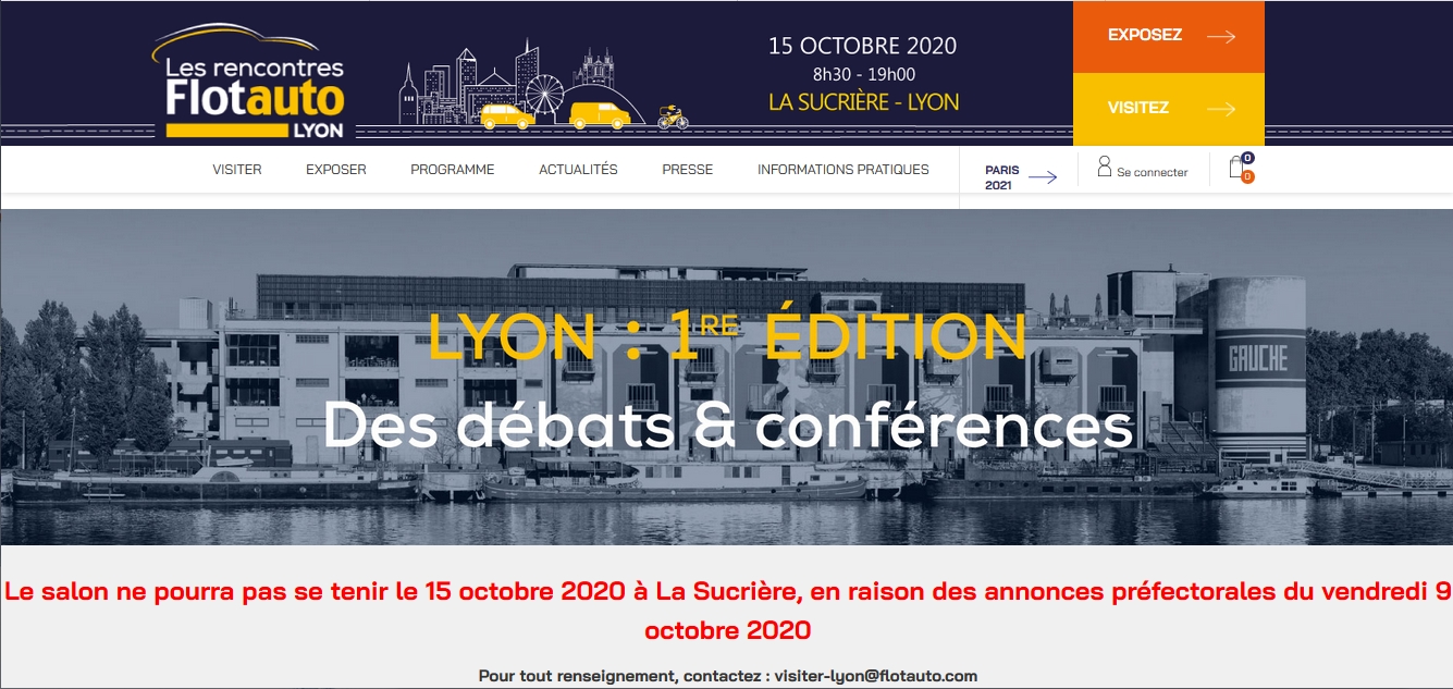Services 09 octobre 2020 - 12:00 Le salon Flotauto Lyon, qui devait se tenir le 15 octobre prochain à la Sucrière, est reporté en raison des annonces préfectorales du vendredi 9 octobre...