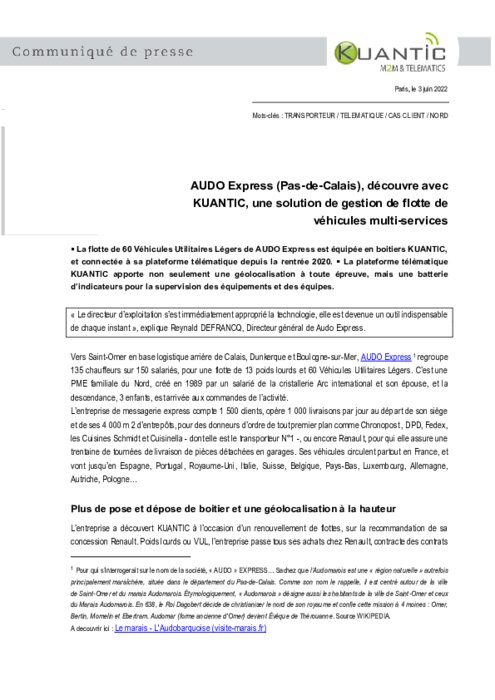 La flotte de 60 Véhicules Utilitaires Légers de AUDO Express est équipée en boitiers KUANTIC, et connectée à sa plateforme télématique depuis la rentrée 2020. La plateforme télématique KUANTIC apporte non seulement une géolocalisation à toute épreuve, mais une batterie d’indicateurs pour la supervision des équipements et des équipes.