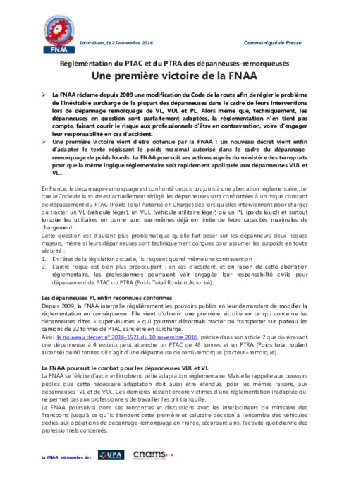 La FNAA réclame depuis 2009 une modification du Code de la route afin de régler le problème de l’inévitable surcharge de la plupart des dépanneuses dans le cadre de leurs interventions lors de dépannage remorquage de VL, VUL et PL. Une première victoire vient d’être obtenue par la FNAA : un nouveau décret vient enfin d’adapter le texte régissant le poids maximal autorisé dans le cadre du dépannage-remorquage de poids lourds.