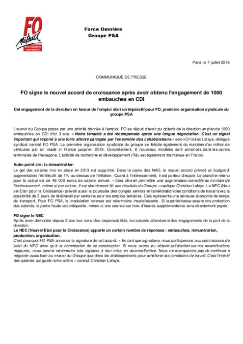 Cet engagement de la direction en faveur de l'emploi était un impératif pour FO, 1ère organisation syndicale du groupe PSA. L'avenir du Groupe passe par une priorité donnée à l'emploi. FO se réjouit d'avoir pu obtenir de la direction un plan de 1000 embauches en CDI d'ici 3 ans. " Notre ténacitéa étérécompensée après une longue négociation. C'est un signal important qui répond à une forte attente partagée par l'ensemble des collaborateurs " selon Christian Lafaye, délégué syndical central FO.