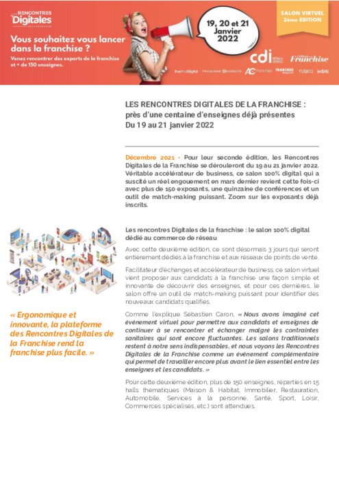 Pour leur seconde édition, les Rencontres Digitales de la Franchise se dérouleront du 19 au 21 janvier 2022. Véritable accélérateur de business, ce salon 100% digital qui a suscité un réel engouement en mars dernier revient cette fois-ci avec plus de 150 exposants, une quinzaine de conférences et un outil de match-making puissant. Zoom sur les exposants déjà inscrits.