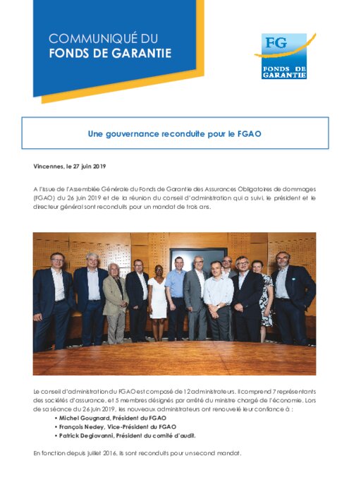 A l'issue de l'Assemblée Générale du Fonds de Garantie des Assurances Obligatoires de dommages (FGAO) du 26 juin 2019 et de la réunion du conseil d'administration qui a suivi, le président et le directeur général sont reconduits pour un mandat de trois ans.