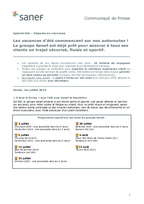 Cet été, le groupe Sanef propose à ses clients petits et grands, une pause détente et sportive sur ses aires, pour lutter contre la fatigue au volant. Pour un arrêt réussi et revigorant, après