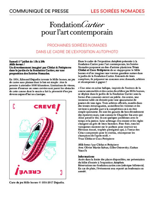 Dans le cadre de l’exposition Autophoto présentée à la Fondation Cartier pour l’art contemporain, les Soirées Nomades proposent au duo d’artistes plasticiens Yvan Clédat et Coco Petitpierre de se réapproprier le Mille bornes et d’en imaginer une version grandeur nature dans le jardin de la Fondation Cartier. Entourés de leurs complices, ils préparent un concours avec dossards, arbitres et récompenses à gagner !