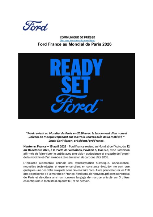 Ford France revient au Mondial de l'Auto, du 12 au 18 octobre 2026, à la Porte de Versailles, Pavillon 5, Hall 5.3, avec l’ambition affirmée de faire vibrer le public avec une vision audacieuse et engagée de l'avenir de la mobilité et d’un monde à zéro émission de carbone d'ici 2035.