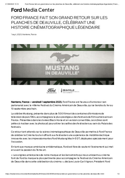 Ford France est heureux d'annoncer son partenariat avec le 49ème Festival du Cinéma Américain de Deauville, qui se tiendra du 1er au 10 septembre prochain. La célèbre Mustang, présente dans plus de 500 films et des centaines d’émissions de télévision depuis 1964, accompagnera le plus prestigieux des festivals de films américains en France. Présentées dans les livrées Black Horse et en version convertible, ces icônes sont prêtes à rivaliser avec le photocall pour attirer les selfies des festivaliers au sein du Palais des festivals.