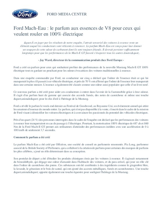 Ford a créé un parfum pour ceux qui souhaitent profiter des performances de la nouvelle Mustang Mach-E GT 100% électrique tout en gardant un penchant pour les odeurs évocatrices des voitures traditionnelles à essence. Dans une enquête commandée par Ford, un conducteur sur cinq a déclaré que l'odeur de l'essence était ce qui lui manquerait le plus s'il passait à un véhicule électrique, et près de 70 % ont affirmé que l'odeur de l'essence leur manquerait dans une certaine mesure.