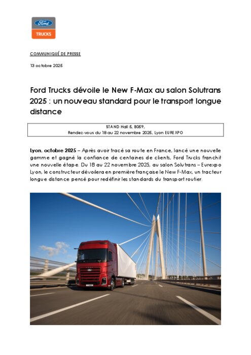 Après avoir tracé sa route en France, lancé une nouvelle gamme et gagné la confiance de centaines de clients, Ford Trucks franchit une nouvelle étape. Du 18 au 22 novembre 2025, au salon Solutrans – Eurexpo Lyon, le constructeur dévoilera en première française le New F-Max, un tracteur longue distance pensé pour redéfinir les standards du transport routier.