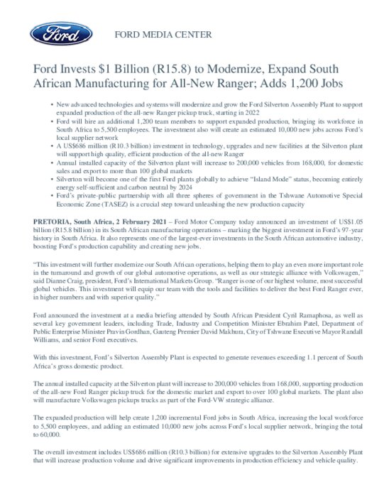 Cet investissement, le plus important en 97 ans de présence de Ford en Afrique du sud, sera utilisé pour moderniser ses activités et augmenter la production de son pickup Ford Ranger.