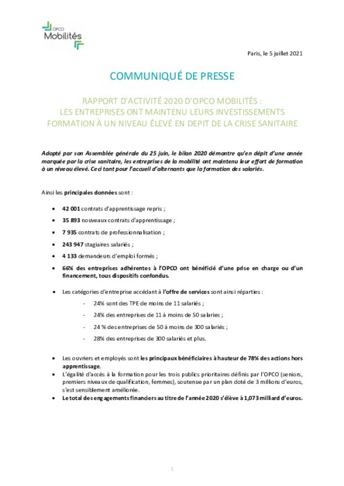 Formation: rapport d’activité 2020 d’OPCO Mobilités