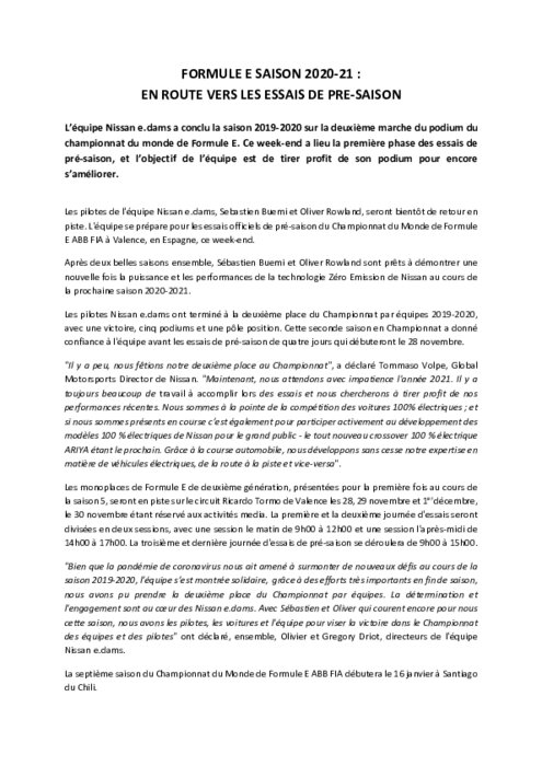 L'équipe Nissan e.dams a conclu la saison 2019-2020 sur la deuxième marche du podium du championnat du monde de Formule E. Ce week-end a lieu la première phase des essais de pré-saison, et l'objectif de l'équipe est de tirer profit de son podium pour encore s'améliorer.