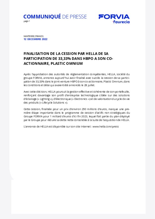 Après l’approbation des autorités de réglementation compétentes, HELLA, société du groupe FORVIA, annonce aujourd'hui avoir finalisé avec succès la cession de sa participation de 33,33% dans le joint-venture HBPO à son co-actionnaire, Plastic Omnium, dans les conditions et délai qui avaient été annoncés le 28 juillet. Avec cette décision, HELLA poursuit la gestion effective et cohérente de son portefeuille, renforçant davantage son profil d’entreprise technologique ciblée.