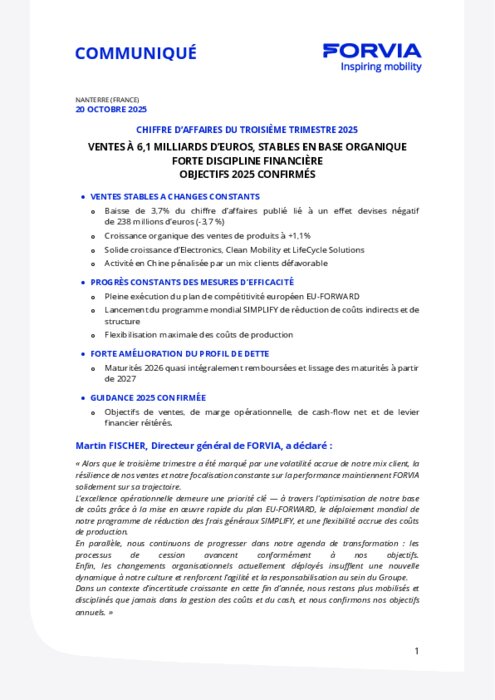 Au troisième trimestre 2025, les ventes consolidées ont atteint 6,12 milliards d’euros, affichant une performance stable en organique, tandis qu’un effet de change négatif de 3,7 % (soit 238 millions d’euros, principalement lié à la dépréciation de l’euro face au dollar et au renminbi) a pesé sur les chiffres publiés.