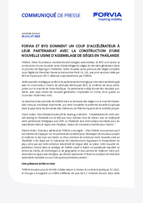 FORVIA, 7ème fournisseur mondial de technologies automobiles, et BYD vont lancer la construction d'une nouvelle usine d'assemblage de sièges de dernière génération dans la province de Rayong en Thaïlande. Cette nouvelle usine produira des sièges complets sous l'égide de Shenzhen Faurecia Automotive Parts Co, Ltd, une joint-venture créée par BYD et Faurecia en 2017, détenue majoritairement par FORVIA.