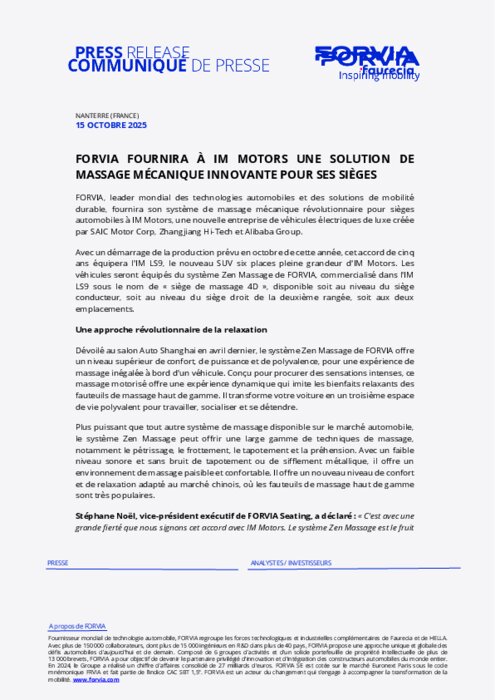 Forvia fournira à IM Motors une solution de massage mécanique innovante pour ses sièges