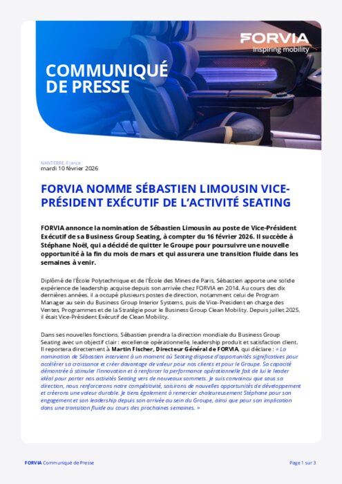 FORVIA annonce la nomination de Sébastien Limousin au poste de Vice-Président Exécutif de sa Business Group Seating, à compter du 16 février 2026. Il succède à Stéphane Noël, qui a décidé de quitter le Groupe pour poursuivre une nouvelle opportunité à la fin du mois de mars et qui assurera une transition fluide dans les semaines à venir.