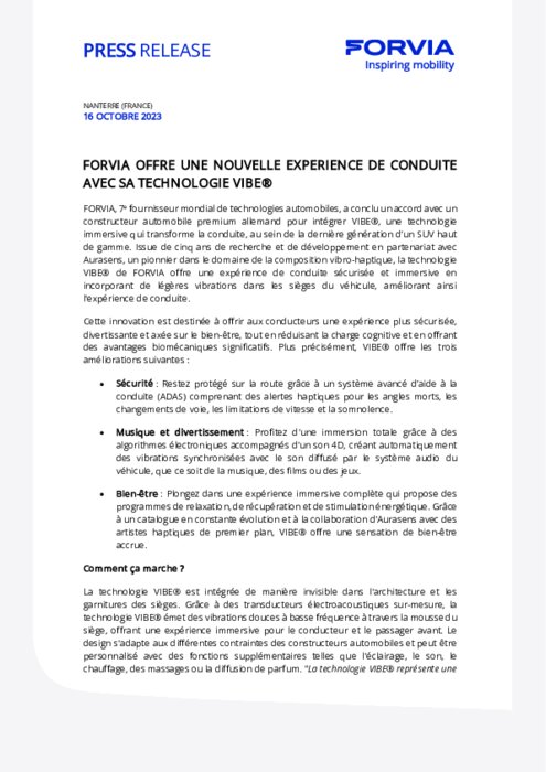 FORVIA, 7e fournisseur mondial de technologies automobiles, a conclu un accord avec un constructeur automobile premium allemand pour intégrer VIBE, une technologie immersive qui transforme la conduite, au sein de la dernière génération d’un SUV haut de gamme.