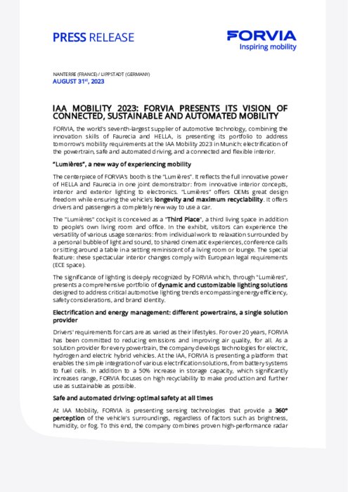 FORVIA, septième équipementier mondial de technologie automobile, combinant les compétences d'innovation de Faurecia et HELLA, présente au salon IAA Mobility 2023 de Munich son offre pour répondre aux besoins de mobilité de demain : électrification du groupe motopropulseur, conduite sûre et automatisée et intérieur connecté et modulable.