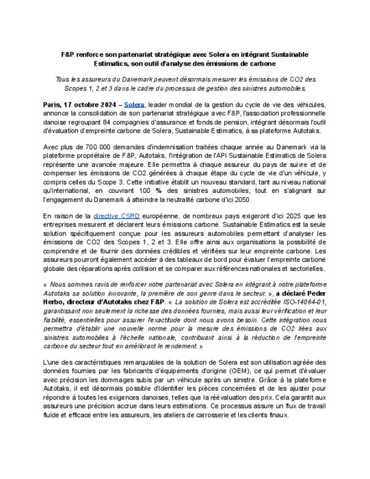 Services 17 octobre 2024 - 10:39 F&P, l'association professionnelle danoise regroupant 84 compagnies d'assurance et fonds de pension, intègre désormais l'outil d'évaluation d’empreinte carbone de Solera, Sustainable Estimatics, à sa plateforme Autotaks. PDF (111 Ko) Télécharger