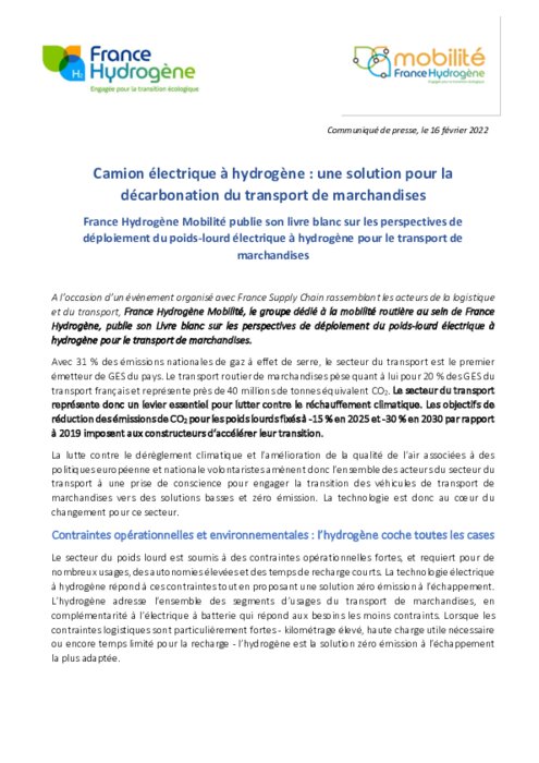 France Hydrogène : Livre blanc sur les perspectives de déploiement du PL électrique à hydrogène