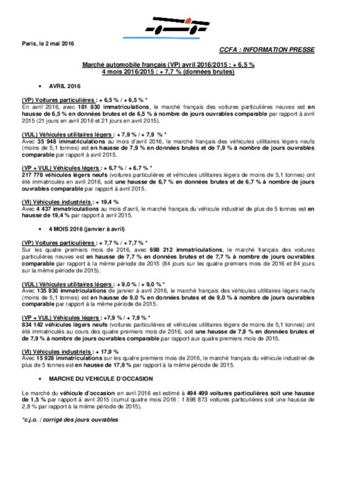 Le groupe Renault a épousé la tendance avec une hausse de ses immatriculations de 6,1% par rapport à avril 2015, tandis que Groupe PSA (ex-Peugeot Citroën) a fait un peu moins bien, n'enregistrant que 4,1%, pénalisé par DS, selon le communiqué du CCFA.