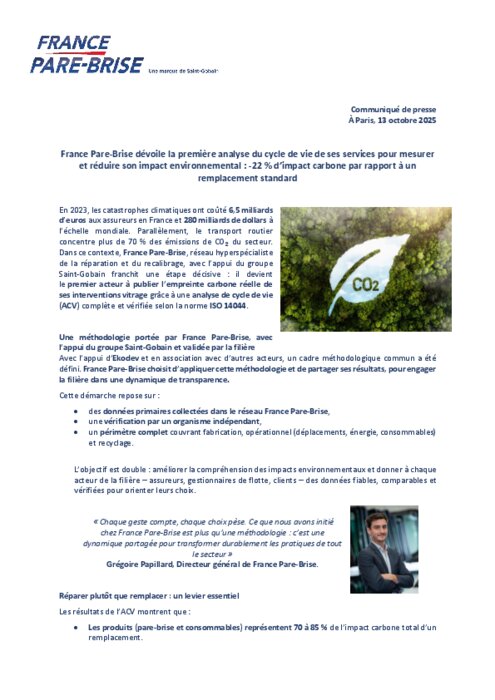 En 2023, les catastrophes climatiques ont coûté 6,5 milliards d’euros aux assureurs en France et 280 milliards de dollars à l’échelle mondiale. Parallèlement, le transport routier concentre plus de 70 % des émissions de CO₂ du secteur. Dans ce contexte, France Pare-Brise, réseau hyperspécialiste de la réparation et du recalibrage, avec l’appui du groupe Saint-Gobain franchit une étape décisive : il devient le premier acteur à publier l’empreinte carbone réelle de ses interventions vitrage grâce à une analyse de cycle de vie (ACV) complète et vérifiée selon la norme ISO 14044.