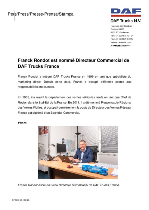 Constructeurs 01 juillet 2021 - 08:46 Franck Rondot a intégré DAF Trucks France en 1999 en tant que spécialiste du marketing direct. Depuis cette date, Franck a occupé différents postes aux responsabilités croissantes. PDF (3 Mo) Télécharger