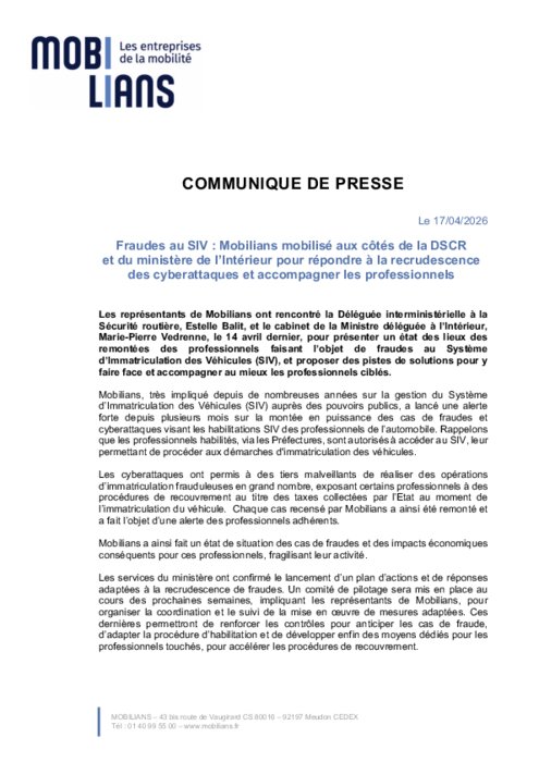 Les représentants de Mobilians ont rencontré la Déléguée interministérielle à la Sécurité routière, Estelle Balit, et le cabinet de la Ministre déléguée à l’Intérieur, Marie-Pierre Vedrenne, le 14 avril dernier, pour présenter un état des lieux des remontées des professionnels faisant l’objet de fraudes au Système d’Immatriculation des Véhicules (SIV), et proposer des pistes de solutions pour y faire face et accompagner au mieux les professionnels ciblés.