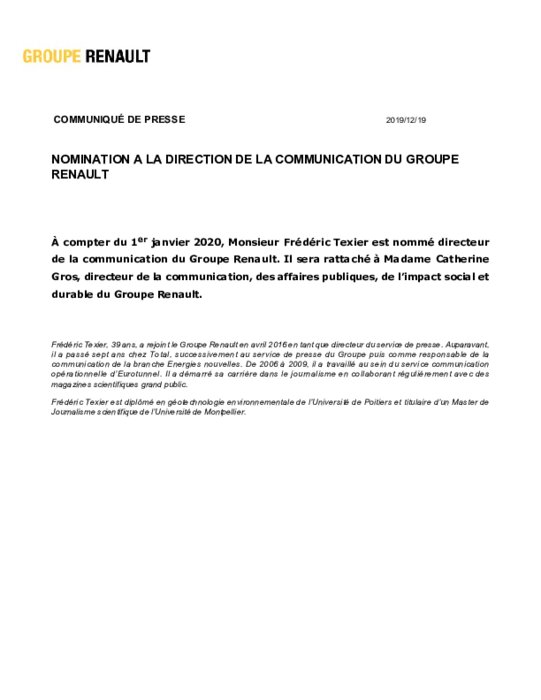 À compter du 1er janvier 2020, Monsieur Frédéric Texier est nommé directeur de la communication du Groupe Renault. Il sera rattaché à Madame Catherine Gros, directeur de la communication, des affaires publiques, de l’impact social et durable du Groupe Renault.