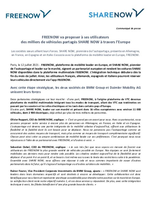 FREENOW, plateforme de mobilité leader en Europe, et SHARE NOW, pionnier de l’autopartage et leader sur le marché, signent un partenariat européen et rendent les voitures SHARE NOW disponibles dans la plateforme multimodale FREENOW. L’intégration technique débutera dès la fin du mois de juillet. Ainsi, les utilisateurs français, allemands, espagnols et italiens pourront réserver leurs véhicules directement via l’app FREENOW.