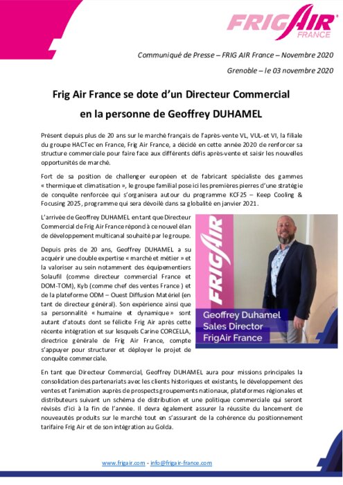 Présent depuis plus de 20 ans sur le marché français de l'après-vente VL, VUL-et VI, la filiale du groupe HACTec en France, Frig Air France, a décidé en cette année 2020 de renforcer sa structure commerciale pour faire face aux différents défis après-vente et saisir les nouvelles opportunités de marché. L'arrivée de Geoffrey DUHAMEL en tant que Directeur Commercial de Frig Air France répond à ce nouvel élan de développement multicanal souhaité par le groupe.