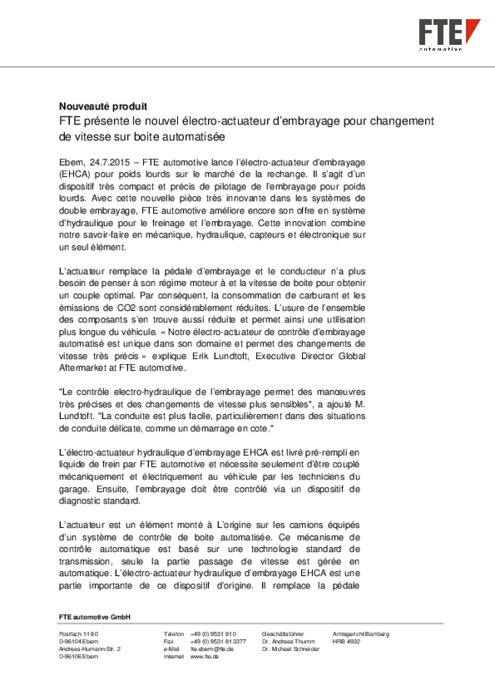 FTE automotive lance l’électro-actuateur d’embrayage (EHCA) pour poids lourds sur le marché de la rechange. Il s’agit d’un dispositif très compact et précis de pilotage de l’embrayage pour poids lourds. Avec cette nouvelle pièce très innovante dans les systèmes de double embrayage, FTE automotive améliore encore son offre en système d’hydraulique pour le freinage et l’embrayage. Cette innovation combine notre savoir-faire en mécanique, hydraulique, capteurs et électronique sur un seul élément.