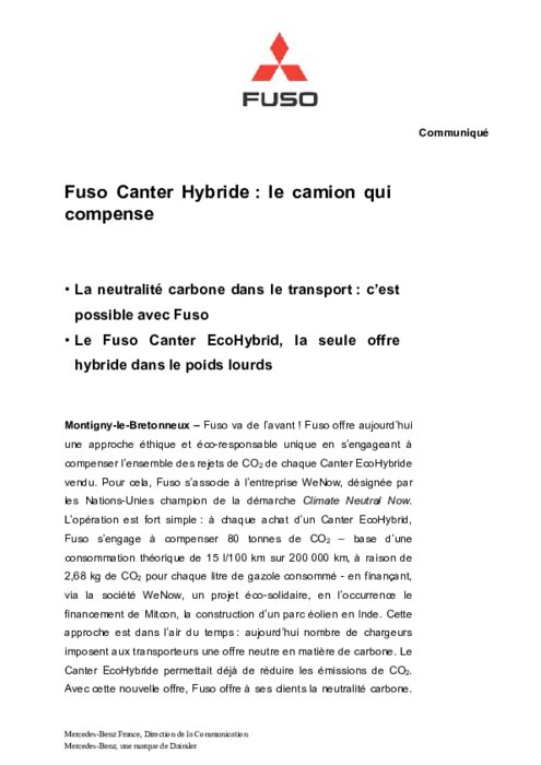Fuso va de l’avant ! Fuso offre aujourd’hui une approche éthique et éco-responsable unique en s’engageant à compenser l’ensemble des rejets de CO2 de chaque Canter EcoHybride vendu. Pour cela, Fuso s’associe à l’entreprise WeNow, désignée par les Nations-Unies champion de la démarche Climate Neutral Now. L’opération est fort simple : à chaque achat d’un Canter EcoHybrid, Fuso s’engage à compenser 80 tonnes de CO2...